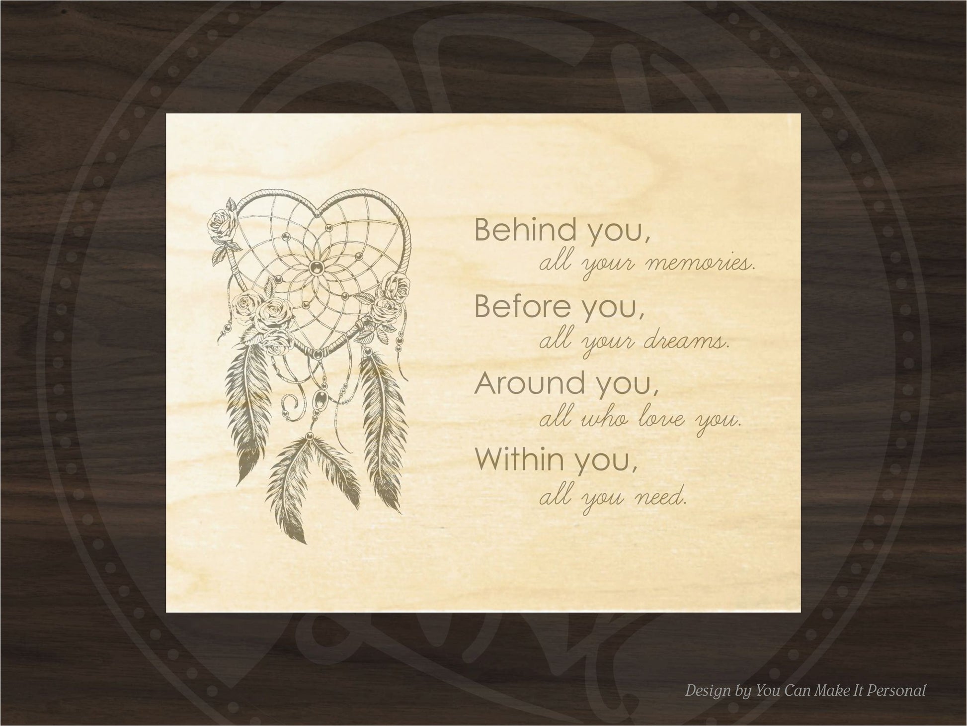 Das Design enthält ein Bild und einen individuellen Spruch auf Wunsch. Sie können das Traumfänger-Bild behalten oder durch ein anderes ersetzen.