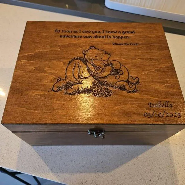 Individuell gravierte Holzbox mit Winnie Puuh Zitat, Erinnerungsbox für ein Kind