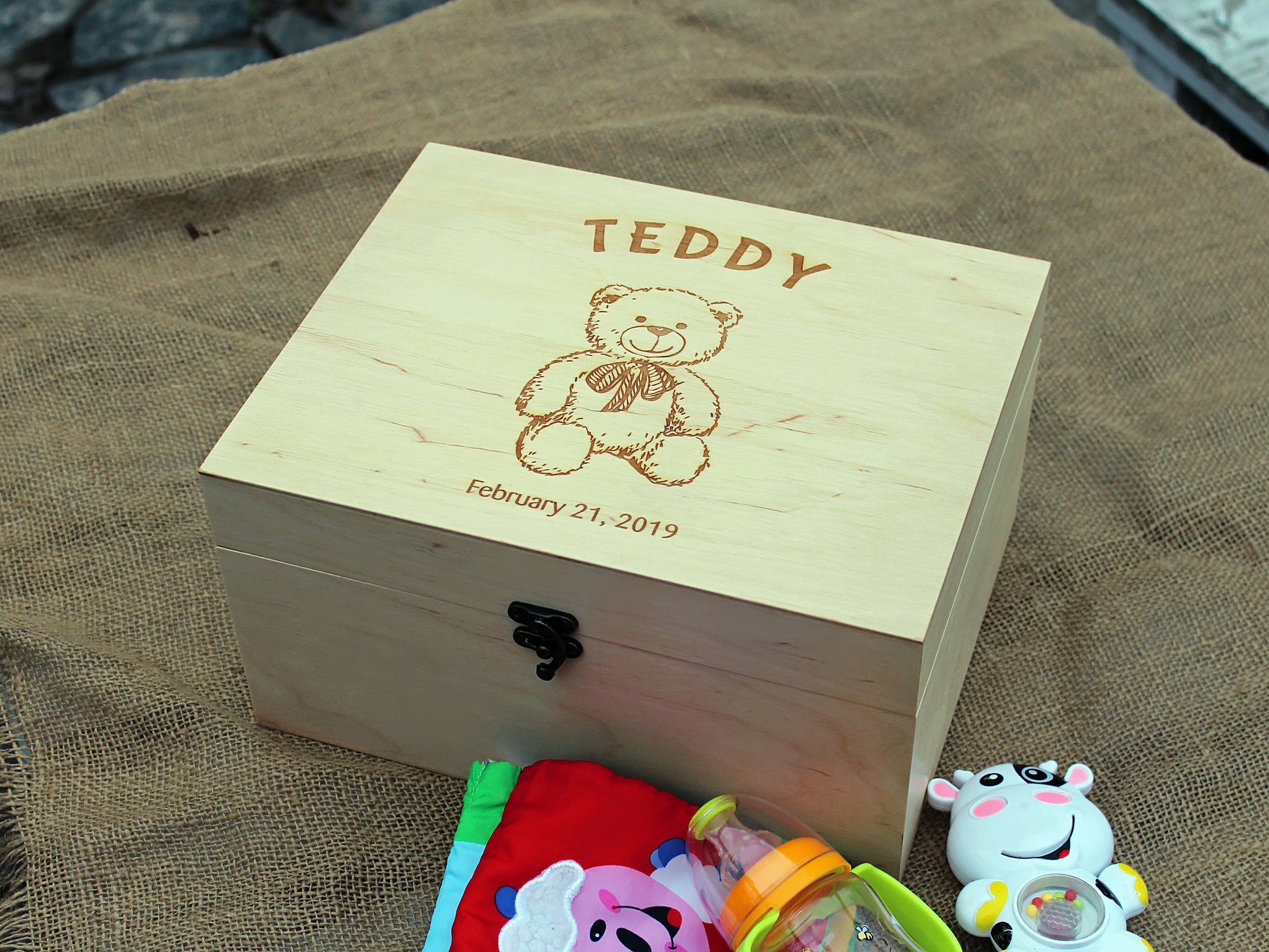 Custom engraved keepsace box with Teddy bear image, Personalized wood box, First birthday gift