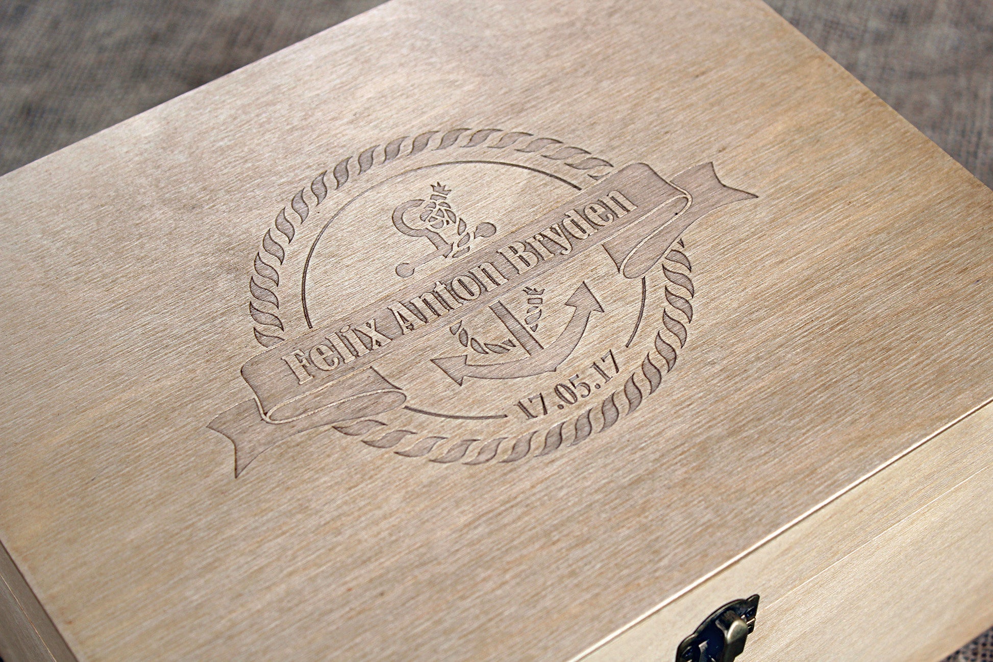 Wooden box with nautical design and name of the child. Keep your baby mementos for a lifetime in this special made to order box. You can add your baby stats or something else on the lid as well as another image. We provide design proof before making your unique box.