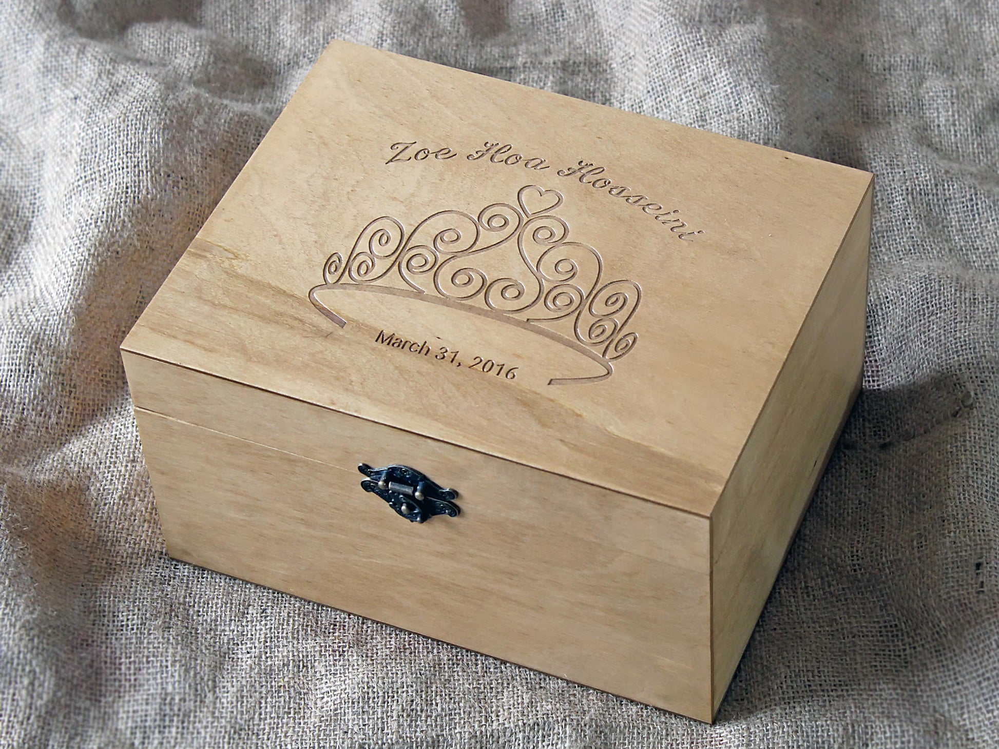 Custom engraved memory box with princess tiara and name, Personalized keepsake box for a girl